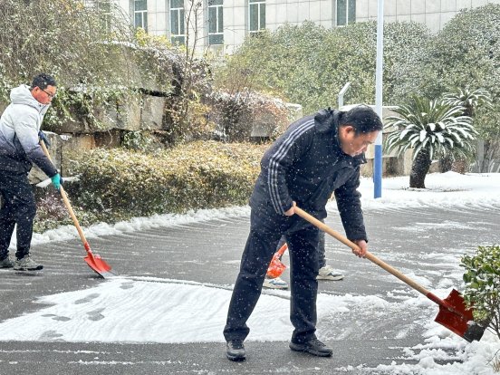 寒风凛冽中,办领导带头挥舞铁锹铲雪开路,干部职工紧随其后、分工协作:有人铲除厚积雪,有人撒布融雪盐加速化冰,有人铺设草垫防滑,现场一派热火朝天的忙碌景象。