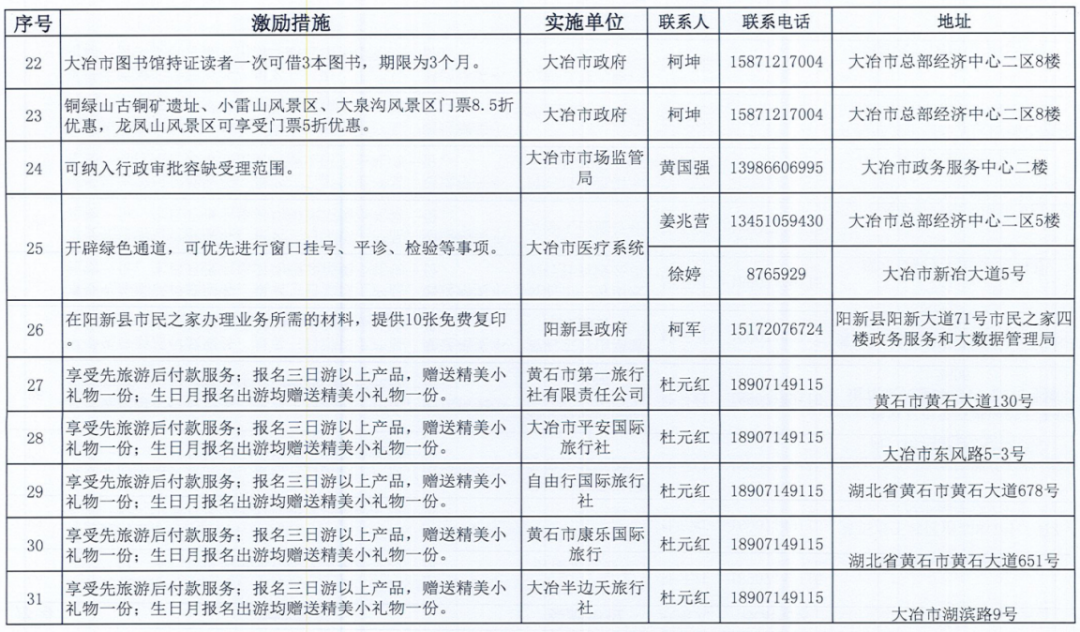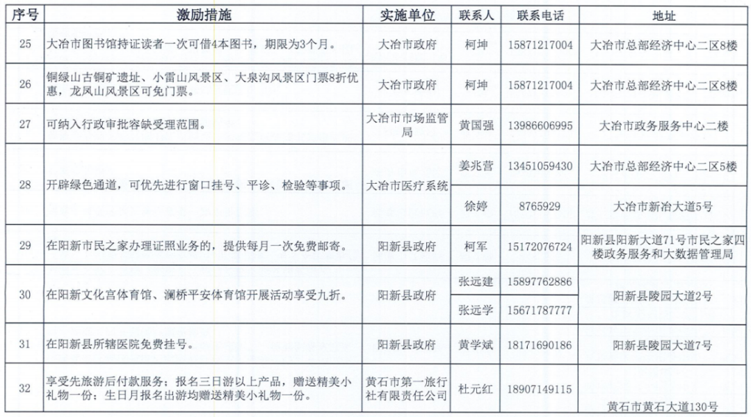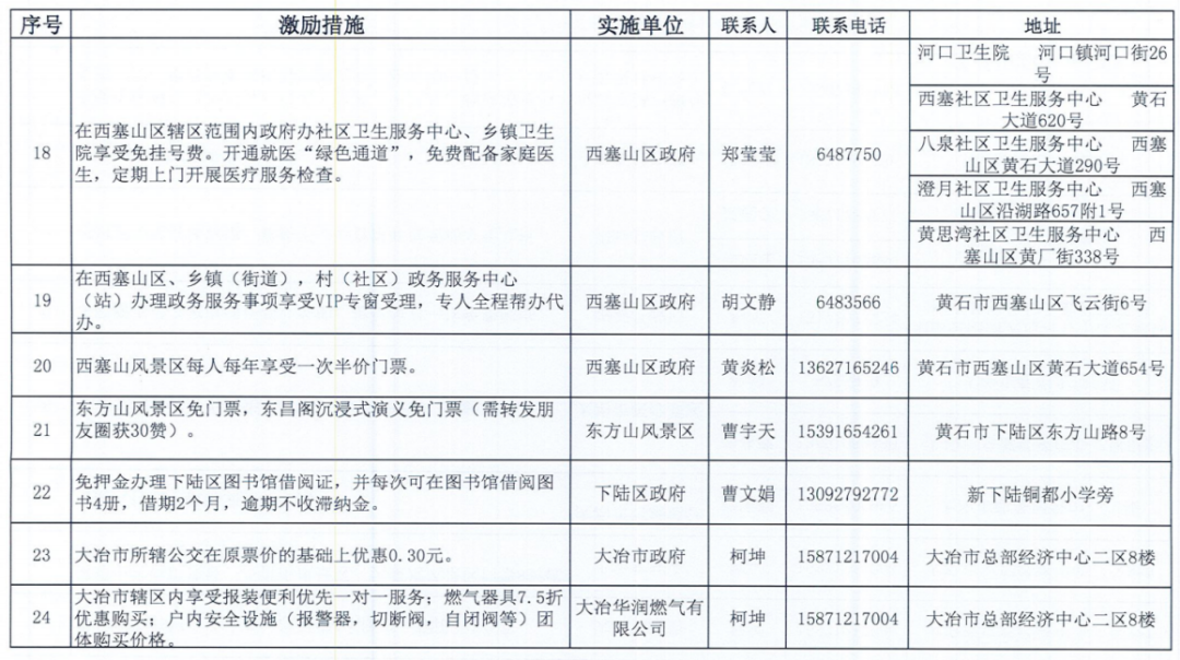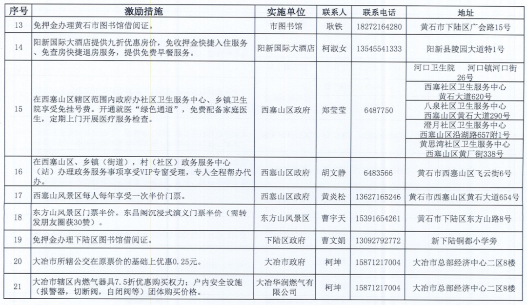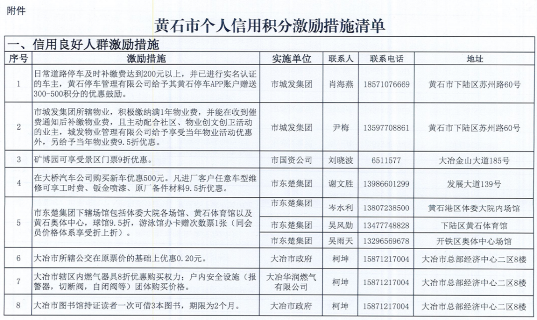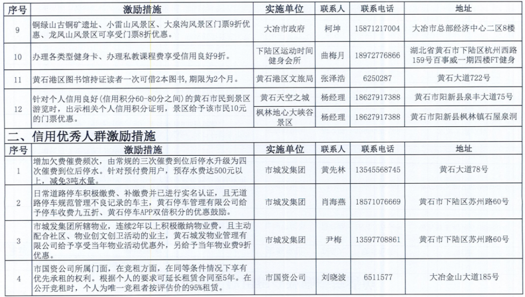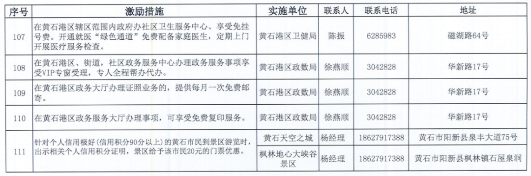 《黄石市个人信用积分激励措施清单》
