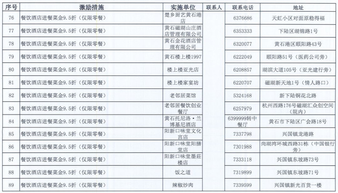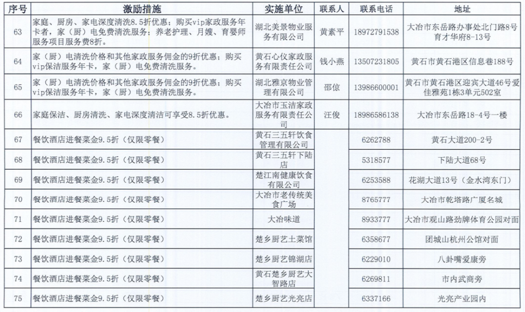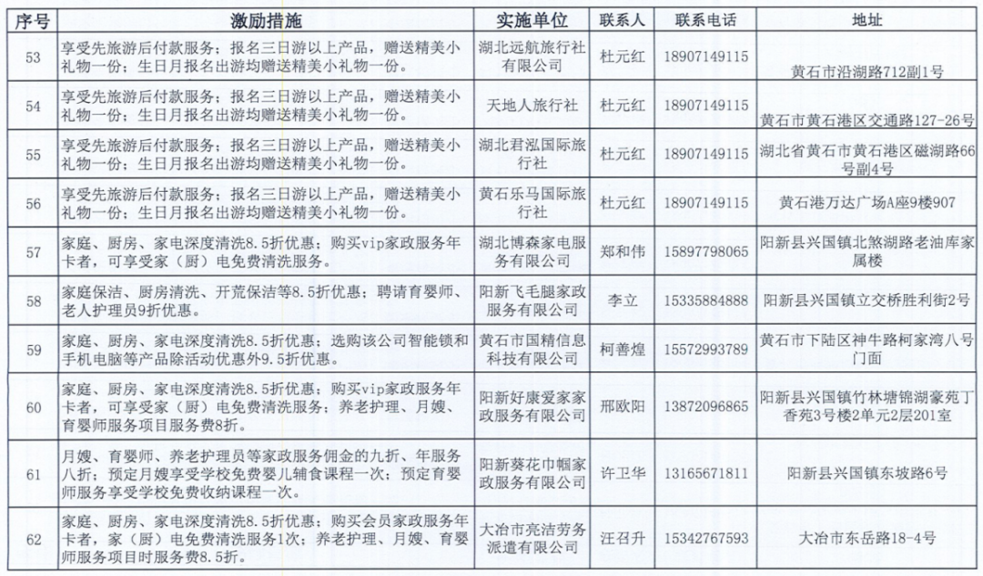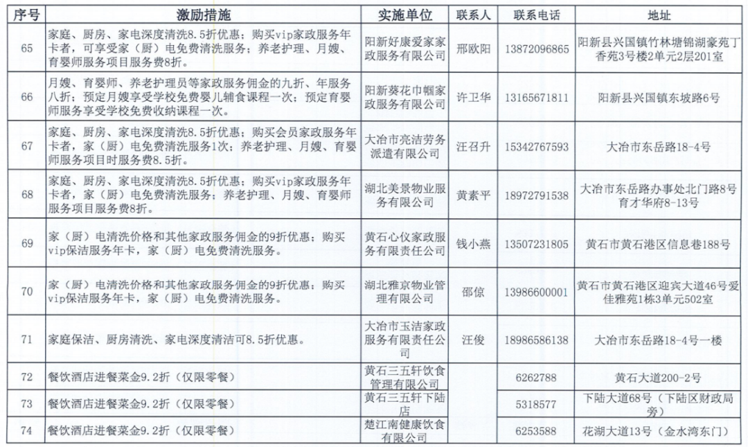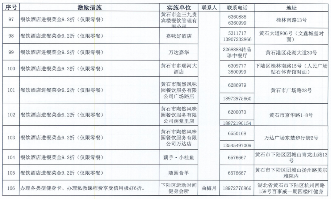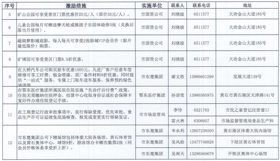 《黄石市个人信用积分激励措施清单》