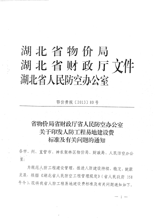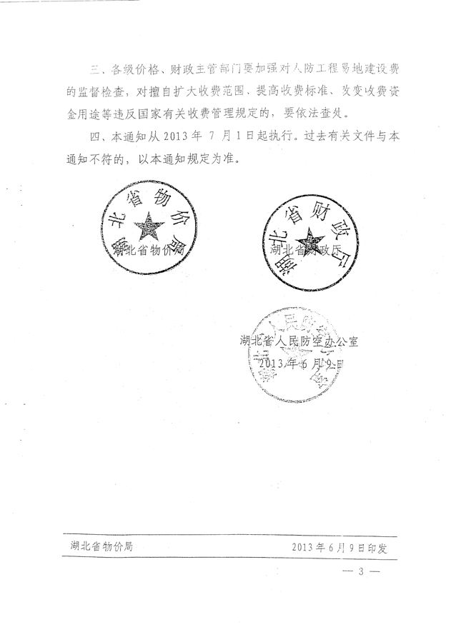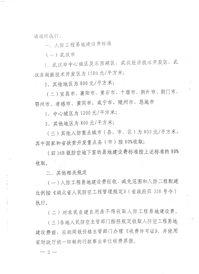 湖北省物价局、湖北省财政厅、湖北省人民防空办公室关于印发人防工程易地建设费标准及有关问题的通知